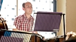 A male timpani player, beats his kettledrums in an orchestral rehearsal.