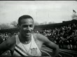 "Track meet drake relays at Des Moines are highlighted by a series of thriller-diller track contests." 11 meet records are shattered with spectacular performances by Olympic sprint star Bobby Morrow, Wilt Chamberlain of basketball fame, and other sports stars. Crowd in college bleachers. Men's hurdles from start to finish. Winner Willie Stevens. 100-yard dash, Bobby Morrow wins. High jumpers include Don Stewart and Wilt Chamberlain, who jumps while wearing a plaid hat resembling golfer's cap. VO says Chamberlain tied the mark, won coin toss to win. Wilt poses, shakes hands with another athlete, possibly Stewart. Very close finish in the mile race; second-place man offers sportsmanlike handshake to winner, Hungarian Laszlo Tabori.