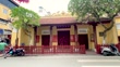 This serene photo showcases the elegant facade of Bach Ma Temple in Hanoi, steeped in quiet charm. The temple features a traditional tiled roof adorned with ornate dragon motifs, painted in vibrant yellow with rich red pillars and doors. A red picket fence lines the front, adding a pop of color, while two lush trees with pink blossoms frame the scene, their branches swaying gently. A man on a scooter pauses nearby, and another scooter rests against the fence, blending everyday life with this historic site. The overcast sky softens the mood, highlighting the temple’s cultural significance in the heart of the city.