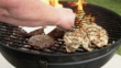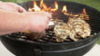 A video of grilled chicken and hamburgers with a woman putting cheddar cheeses on them