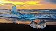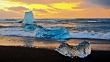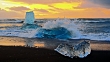 Slow motion dolly shot of sea waves crushing against iceberg on the black beach at sunset. Jokulsarlon. Breidamerkursandur. Iceland.