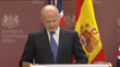 William Hague and Trinidad Jimenez joint press conference; ENGLAND: London: Westminster:INT**BEWARE FLASH PHOTOGRAPHY**William Hague (Foreign Secretary) and Trinidad Jimenez (Spanish Foreign Affairs Minister) along to podiums / William Hague (Foreign Secretary) press conference SOT- The relationship between our countries is a strong one and a historic one / over 800,000 British people live in Spain / Spain's support is of enormous value to UK / keen to explore ways our countries can work together / Britain's retreat from Latin American is over and it's now time for an advance to begin / Spain is an important ally in the European Union / both returned recently from visits to the Middle East / already discussed our views of the changing political situation in the Middle East / earlier today I made a short statement in the House of Commons over events in Bahrain, conveying our concerns about what happened overnight / we've stressed the need for peaceful action to address concerns of protesters and the importance of the right to peaceful protest and for freedom of expression / asked Bahraini government to move quickly on it's committment to a transparent investigation into earlier deaths and to include this morning's events / it's time to build bridges between different religious communities in Bahrain / Bahrain has made important political reforms alongside its growing economic success / I've been assured by Bahraini leaders that their government intends to build on these reforms and is sincere about it / the long friendship between Bahrain and the UK / across the Middle East we call for the right to peaceful protest and effective economic development and more open and flexible political systems / we call for right to peaceful protest to be affirmed in Libya and Iran as well as Bahrain / I'm confident our relationship with Spain will grow stronger in the future / working together with Spanish Foreign Affairs Minister on various issues