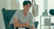 Young Asian man preparing protein shake on sofa in living room at modern home. Diet and healthy food morning routine. - Vídeo de acervo 4K