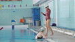 A young woman climbs out of the pool water. End of swimming practice. Slow motion.